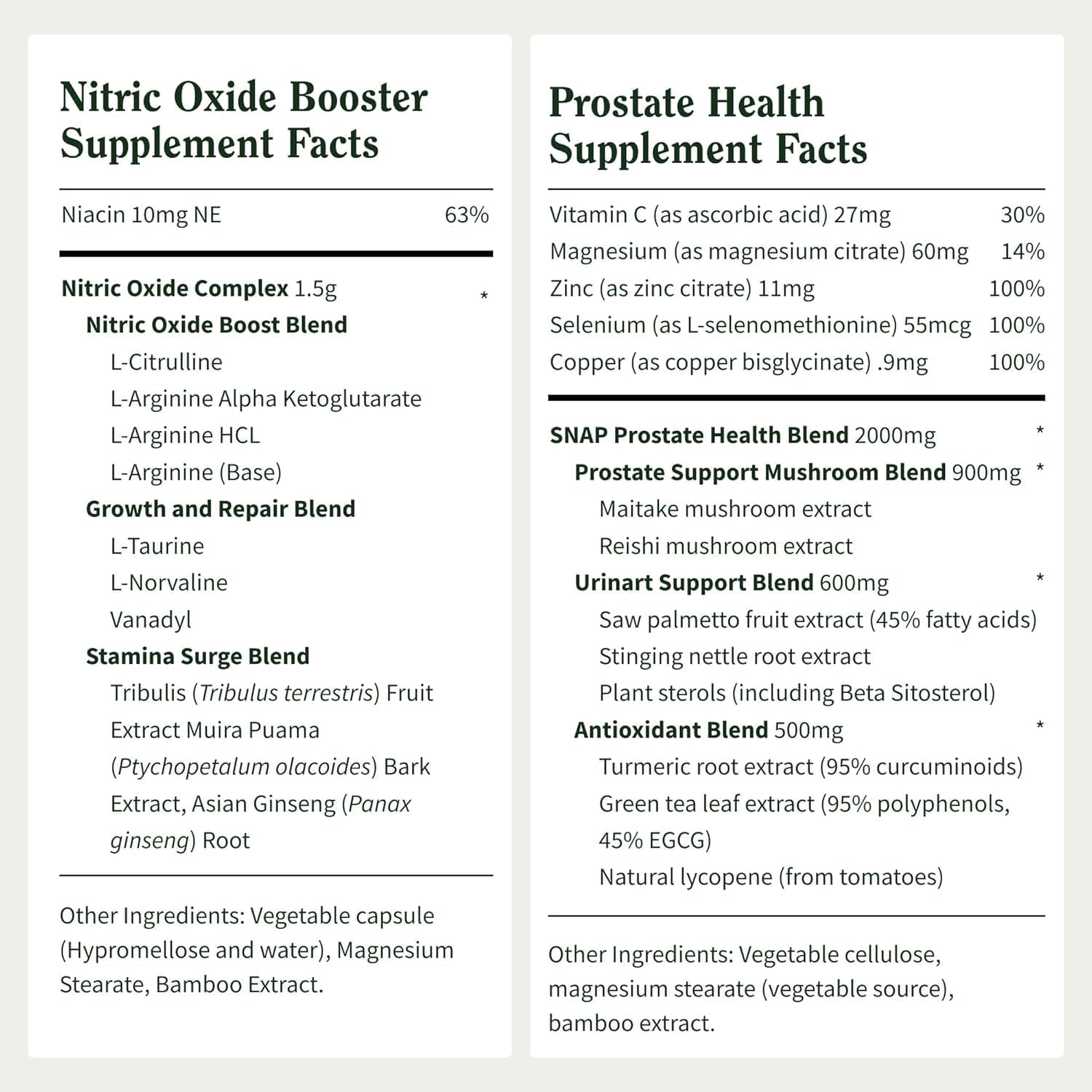 - Dual-Action Wellness Support For Men: This complete two-bottle set includes our Nitric Oxide Booster with ginseng root to support circulation, stamina, daily vitality, and natural energy – without stimulants or added sugars – plus our Prostate Health formula with saw palmetto, nettle root, and plant sterols (including beta sitosterol) to support urinary wellness, prostate health, and healthy immune function.